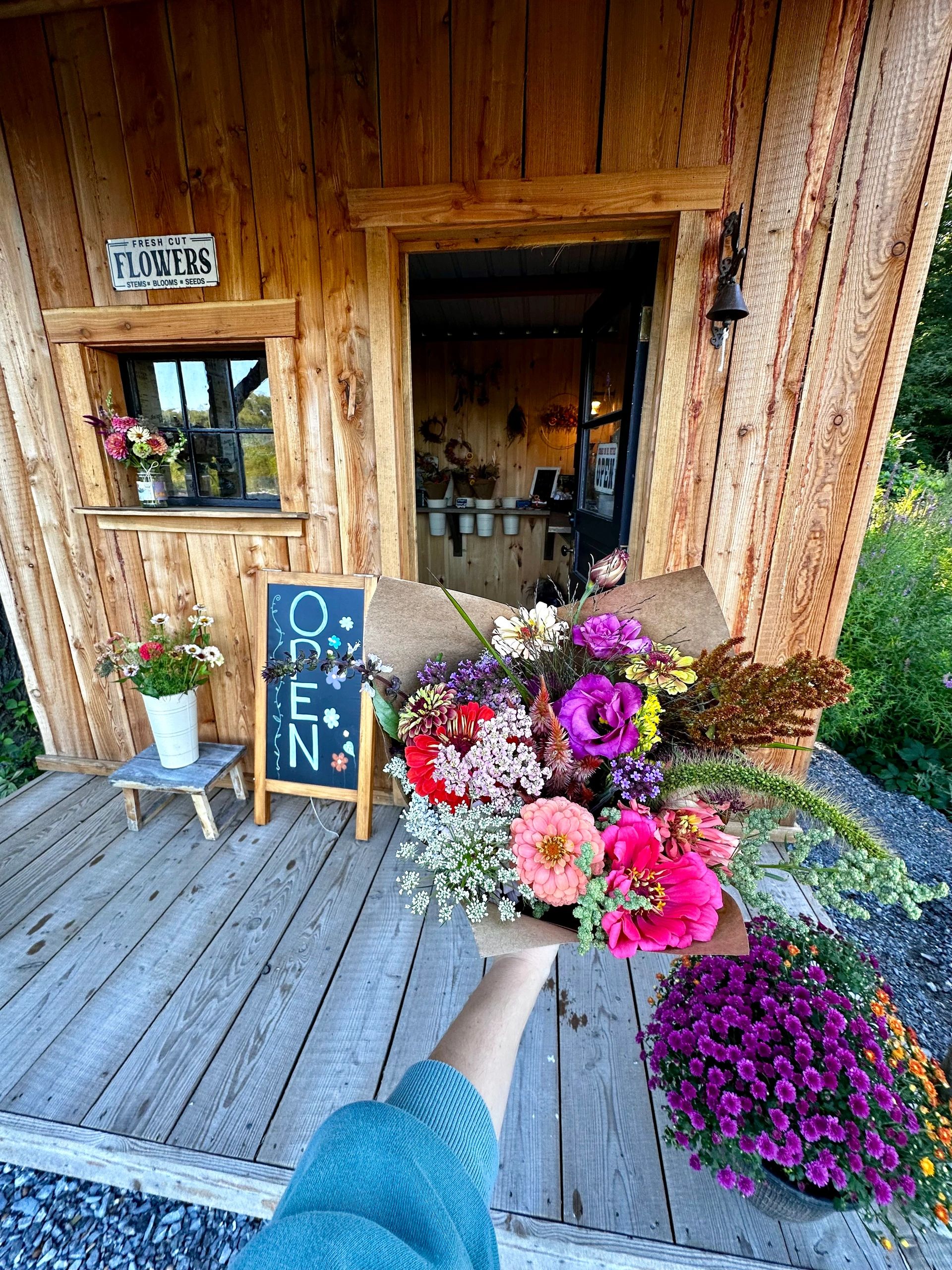 We are a micro flower farm in Avon, NY selling our homegrown flowers and other goods from our self-serve farm shop, the Bloom Saloon, located on Bronson Hill Rd. We also offer garden coaching and planning in the WNY/Rochester NY area.